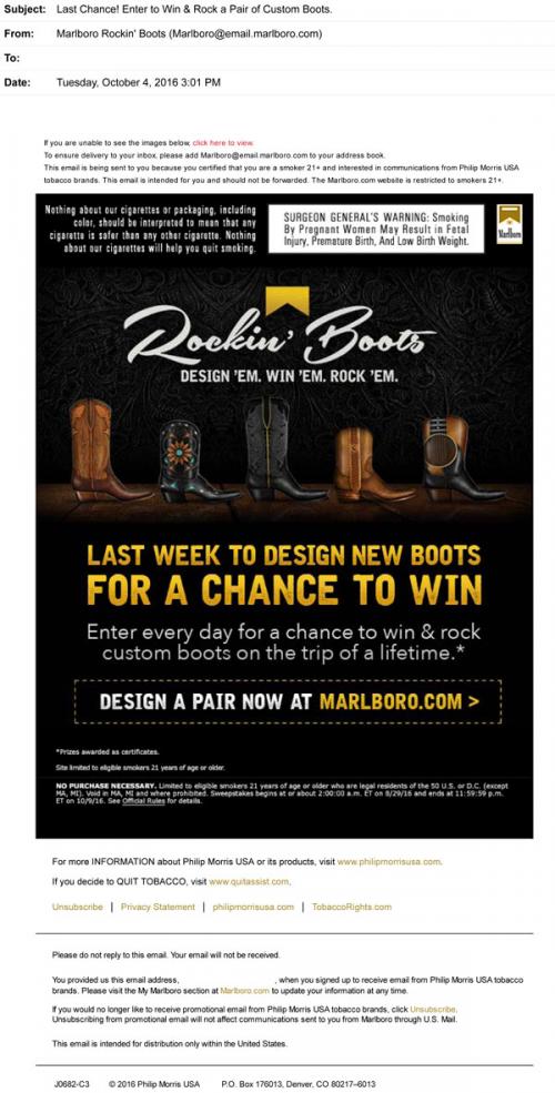 Marlboro email from October 2016 announcing the last chance to enter the Rockin' Boots sweepstakes. Provides a link to the brand website to design a boot and enter.