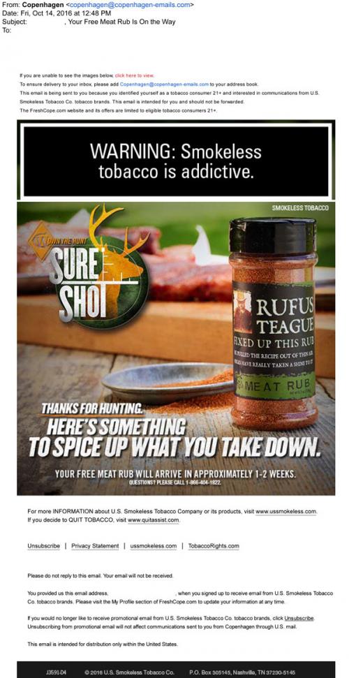 Email from Copenhagen in October 2016 thanking the recipient for participating in their Own the Hunt: Sure Shot sweepstakes. The email confirms that a promotional gift for participating, a meat rub to "spice up what you take down," is in the mail.