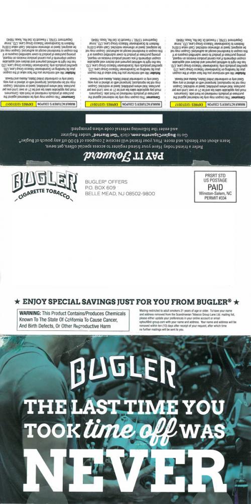 Direct mail from Bugler received in October 2016 that contains coupons and a promotional code to refer a friend for extra discounts. Describes their different roll your own tobacco blends and refers the customer to their online store locator. Text: "The last time you took time off was never. You've earned it."