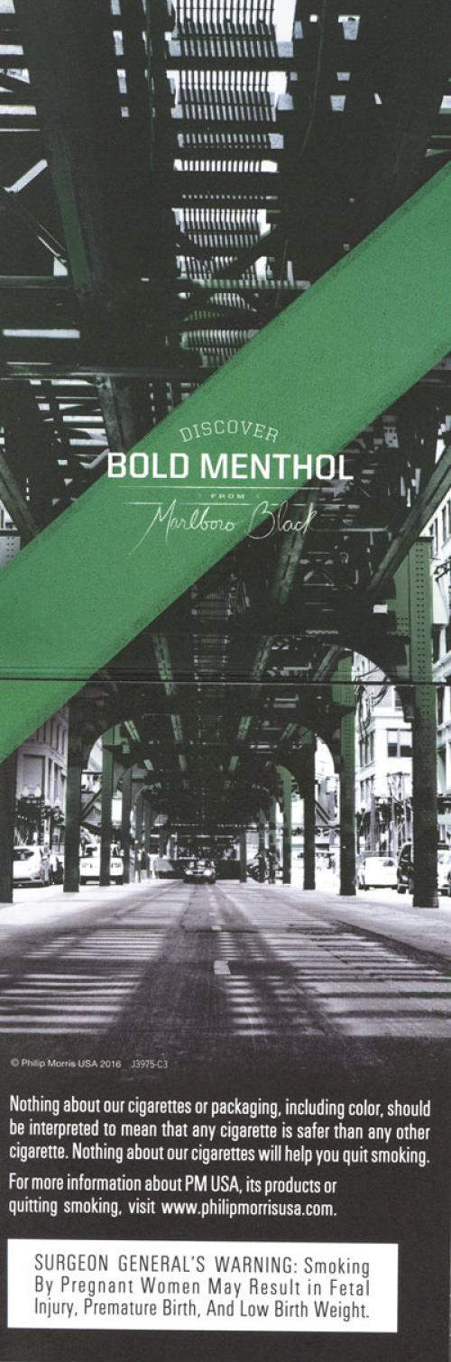 Direct mail from Marlboro Black received in November 2016 that contains coupons and promotes their new Slate bold menthol, now available in stores. Unfolds as a booklet with modern, urban imagery in a green and black color palette.