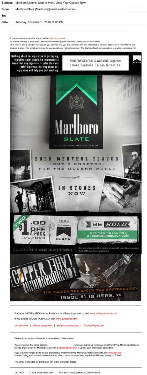 Marlboro Black email from November 2016 promoting the new Slate product, a bold menthol cigarette now in stores. Also links to claim a coupon and check out the Copper Label Underground series on the brand website.