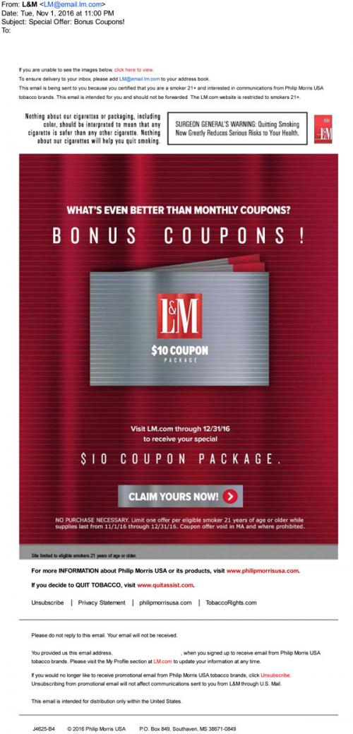 L&M email offering a special bonus coupon package worth up to 10$, with a link to claim it on the brand website.