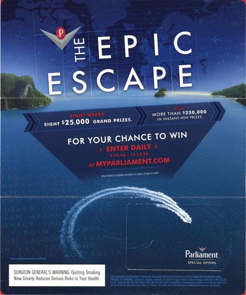 Direct mail received in October 2016 from Parliament in promotion of their Epic Escape sweepstakes. Reminds the recipient to enter daily on the brand website and provides the duration of the sweepstakes. Also contains coupons, on of which features the image of a menthol pack.