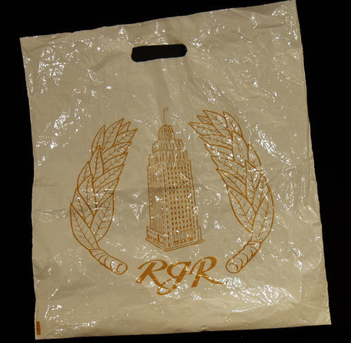 White plastic bag with gold image of "RJR" and 2 bundles of tobacco around a building.