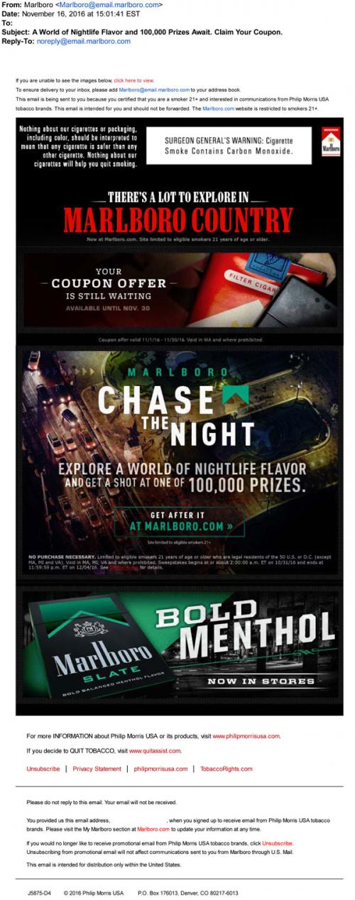 Email from Marlboro in November 2016 with a reminder to claim monthly coupons on the brand website. Includes a promotion for the newest Marlboro Menthol