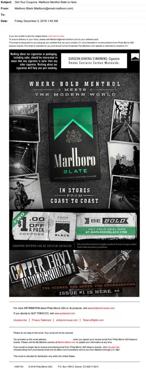 Email from Marlboro Black in December 2016 announcing the availability of Slate menthol in stores across the country, with a link to claim coupons on the brand website. Also promotes Copper Label: Underground Issue #1, with highlights from the underground band scene and music.