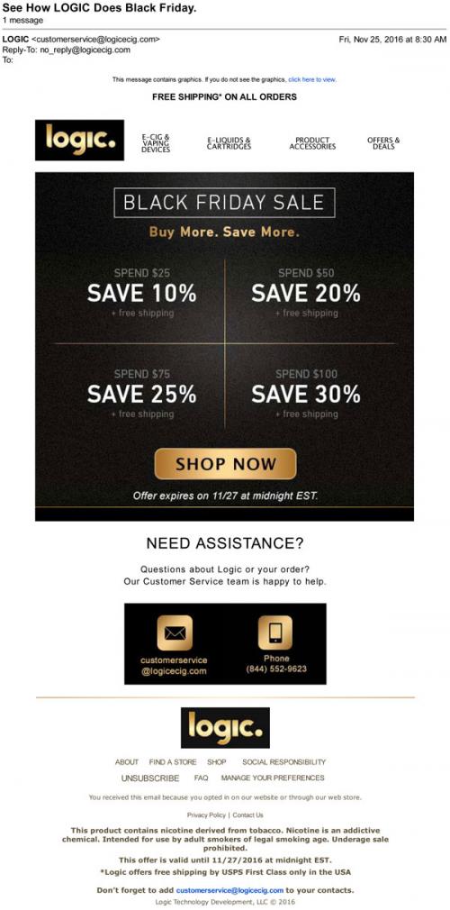 A Black Friday sale announcement via email from Logic in November 2016. The email advertises different discounts available when making a purchase through the store on the brand website.