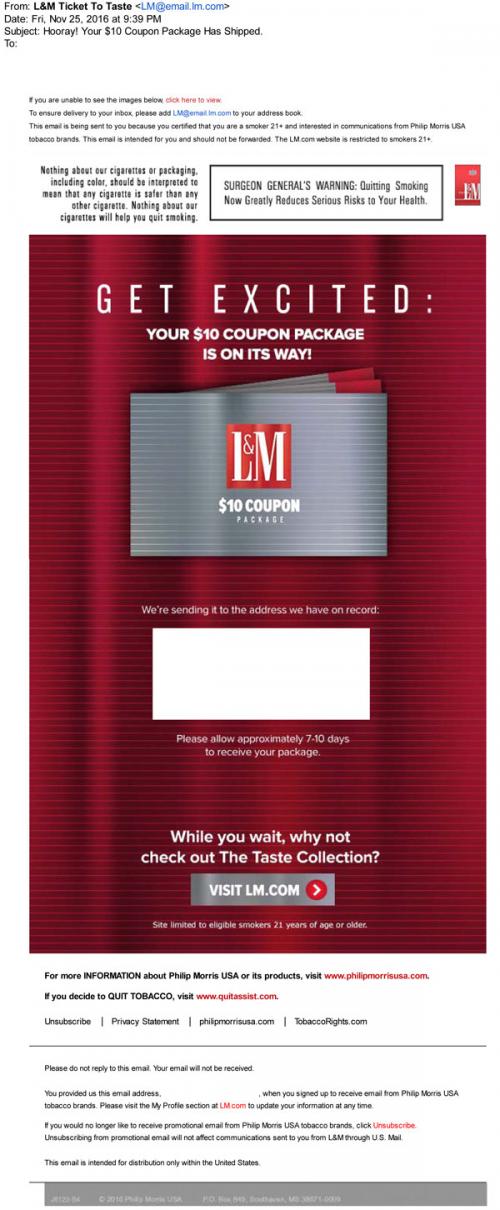 Email from L&M in November 2016 announcing that the requested extra coupon package is in the mail. Also invites the recipient to check out more offers on the brand website.
