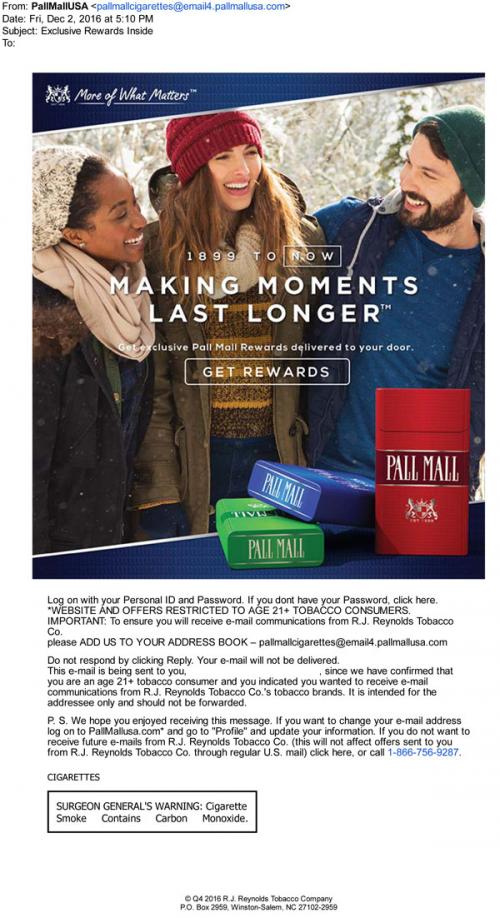 Email from Pall Mall in December 2016 linking to the brand website to claim coupons. Image shows two women and a man in a winter scene.