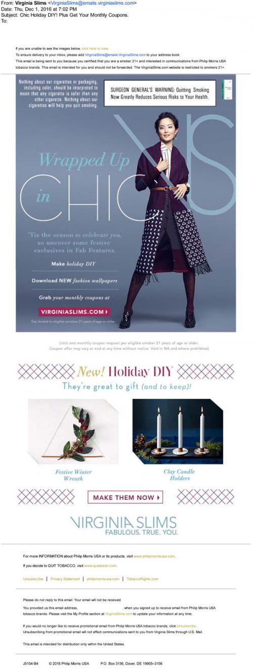 Virginia Slims email from December 2016 linking to some chic holiday DIY on the brand website, and an invitation to claim the latest monthly coupons.