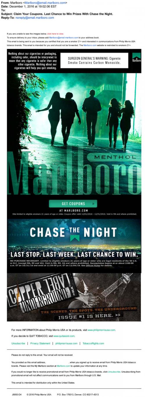 Email from Marlboro Menthol in December 2016 promoting the last chance to enter the Chase the Night sweepstakes. Also links to the brand website to claim monthly coupons and check out the Copper Label: Underground feature on bands from Marlboro Black.