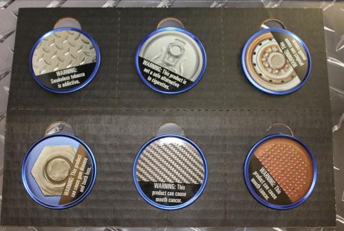 In December 2016 Grizzly sent out a 6-pack of metal can lids to promote their dark mint products, each printed with an industrial metal pattern. The envelope and folder containing the lids have a metal pattern. The included card thanks the recipient for claiming the free gift and directs them to the brand website "to see what else Grizzly is packing," with the slogan, "A real man shows his metal."