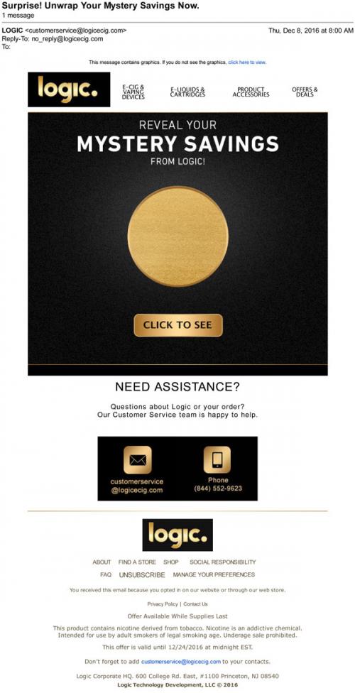 Logic email from December 2016 with a "mystery savings" coupon, which links to the brand website and is revealed to be a discount off of their rechargeable e-cig products.