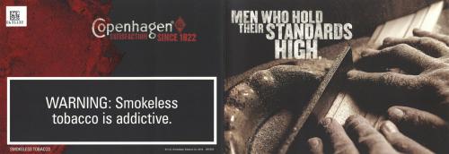 Direct mail from Copenhagen received in December 2016. Delivers coupons with a fold-out piece that has a manly message and workshop imagery. Reminds the recipient to visit the brand website on their mobile device to get weekly offers via their phone. Text: "Men who hold their standards high, Hold their heads even higher. Here's to never settling for anything but the best."