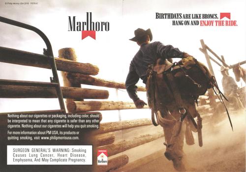 A birthday card received from Marlboro in December 2016. Contains coupons and rodeo imagery. Text: "Birthdays are like broncs. Hang on and enjoy the ride."