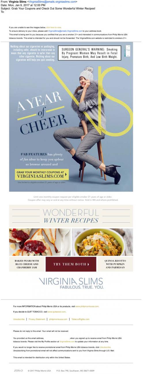 Virginia Slims email from January 2017 promoting fab features on the brand website, like winter recipes, and monthly coupons to claim.