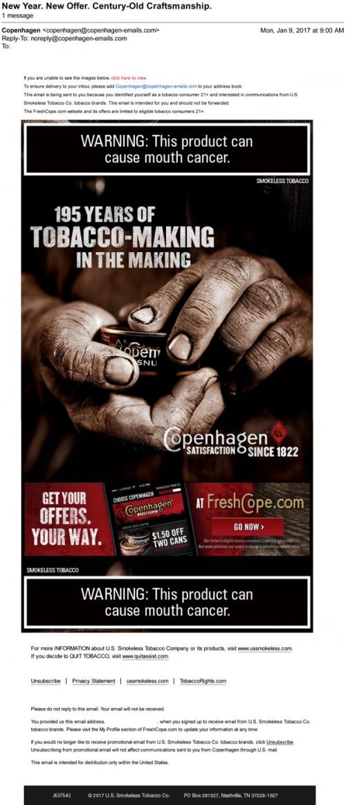 Copenhagen email linking to the brand website to claim a new coupon offer for the new year. Also reminds the recipient to access the site on a mobile device to get extra offers.