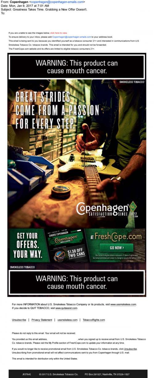 Email from Copenhagen in January 2017 highlighting the ease in claiming their coupons compared to producing greatness in craftsmanship. Also promotes visiting the brand website on a mobile device for extra coupons. Text: "Great strides come from a passion for every step."
