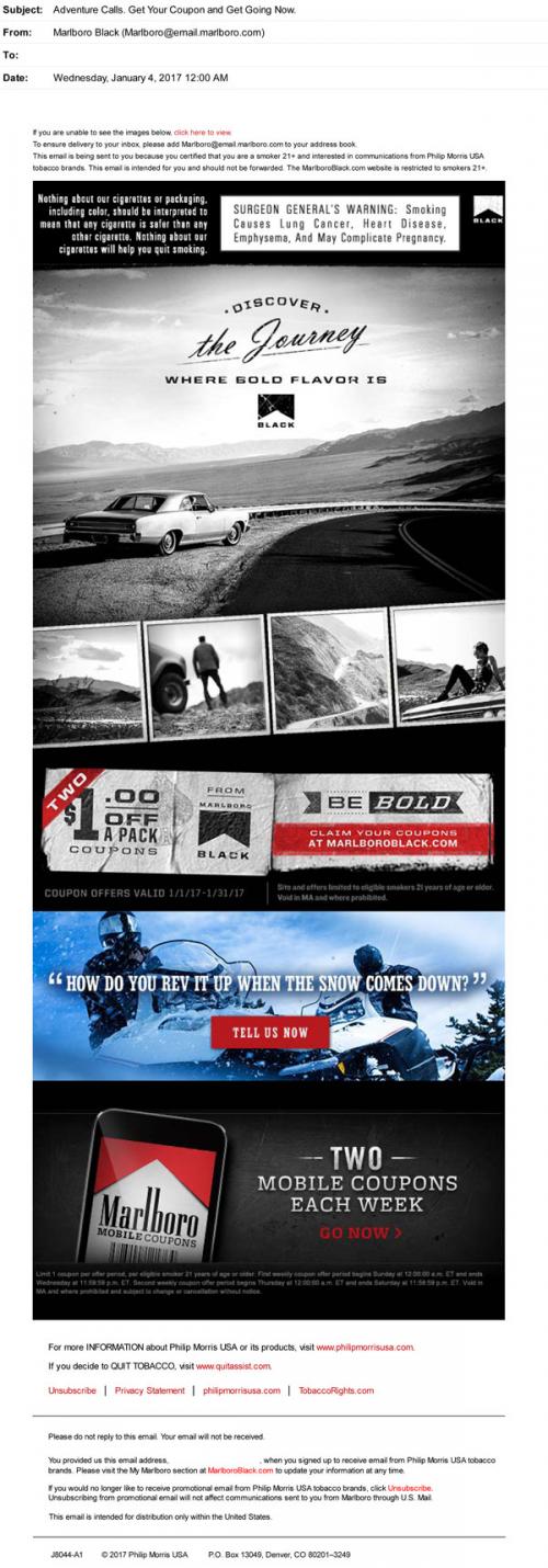 Marlboro Black email from January 2017 linking to coupons on the brand website. Also reminds recipient to claim weekly coupons on their mobile device, and invites them to participate in a discussion about winter activities.