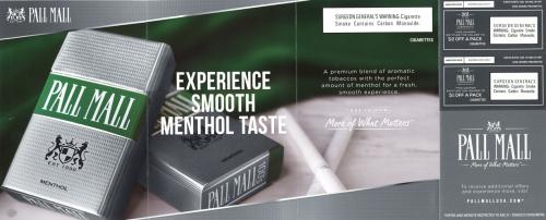 Direct mail promoting the new Pall Mall Silver, a menthol product now available in January 2017. Contains coupons. Text: "A premium blend of aromatic tobaccos with the perfect amount of menthol for a fresh, smooth experience."