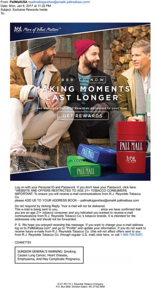 Pall Mall email from January 2017 linking to claim coupons on the brand website. Image shows 3 men outside chatting in a rustic environment.