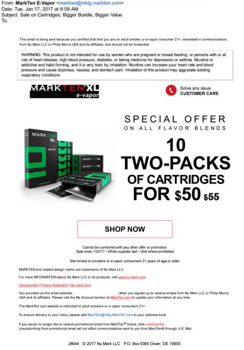 MarkTen email promoting an offer in January 2017 that gives bigger discounts the larger bulk number of cartridges you buy. Links to the online store to purchase. This version promotes their menthol cartridges.