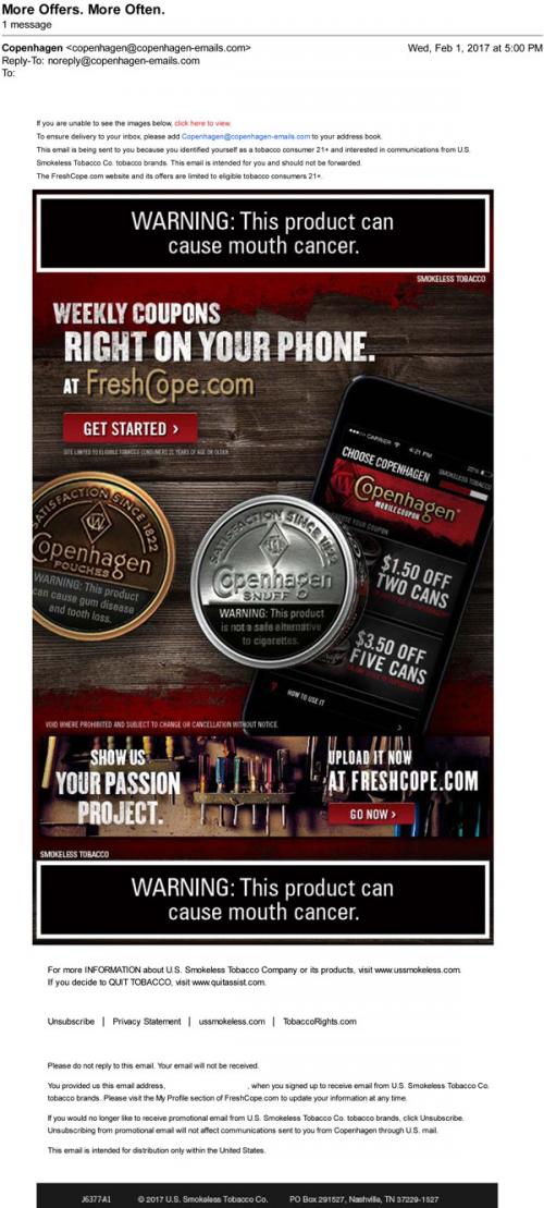 Email from Copenhagen in February 2017 reminding the recipient to use a mobile phone to access the brand website in order to get extra weekly coupons. Includes an invitation to participate with other users by sharing a "passion project" on the site.