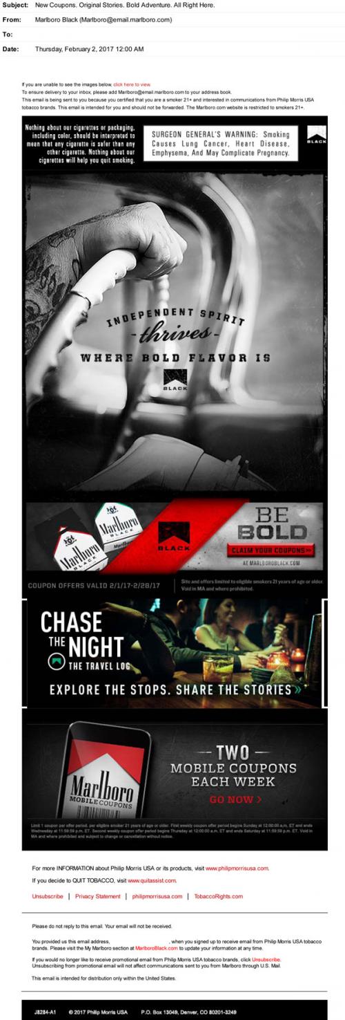 Email from Marlboro Black in February 2017 linking to the brand website to claim monthly coupons. Also reminds the recipient to access the brand website with a mobile phone or other device in order to get extra weekly coupons. Links to the current Chase the Night feature, a nightlife travel log.