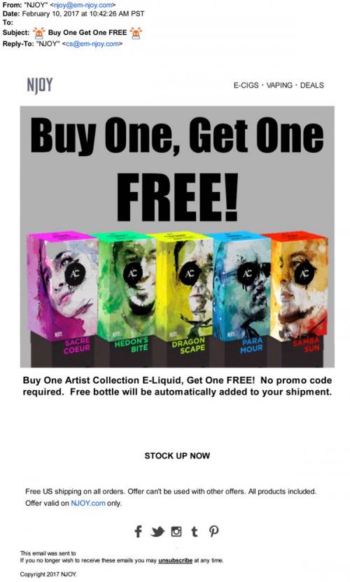 NJOY email from February 2017 announcing a buy one, get one free promotion on their Artist Collection e-liquids through the brand website.