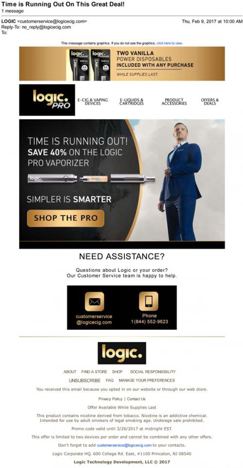 Email from Logic in February 2017 promoting their limited time sale on their Pro vaporizer product. Purchases made through the brand website are also eligible for free flavored disposable products.