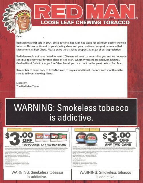 Direct mail from Red Man in February 2017, delivering coupons and describing the heritage of the brand and their commitment to quality. Reminds the recipient to claim new coupons each month on the brand website, and to pass on the word to "your chewing friends."