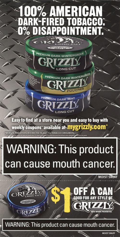 Direct mail from Grizzly in February 2017 promoting their dark-fired tobacco products, mint and wintergreen flavors in various styles. Includes a coupon. Text: "Bold taste that's easy to find. 100% American dark-fired tobacco. 0% disappointment."