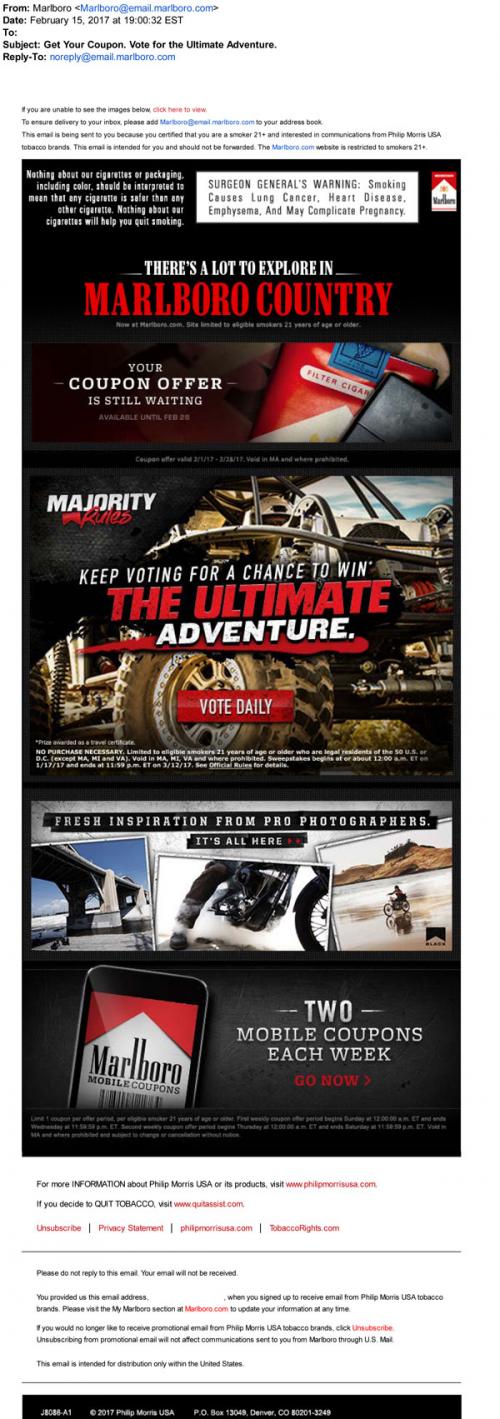Email from Marlboro in February 2017 reminding the recipient to claim their monthly coupon on the brand website. Also promotes the Majority Rules sweepstakes with a link to enter, and mentions a new photography feature to check out. Includes a reminder to get extra coupons every week by visiting the site on a mobile phone.
