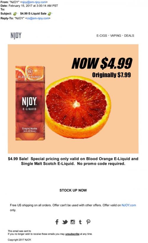 NJOY email from February 2017 announcing a promotional sale for their blood-orange and single malt scotch e-liquids through the brand website store. Provides a link to purchase the discounted items.