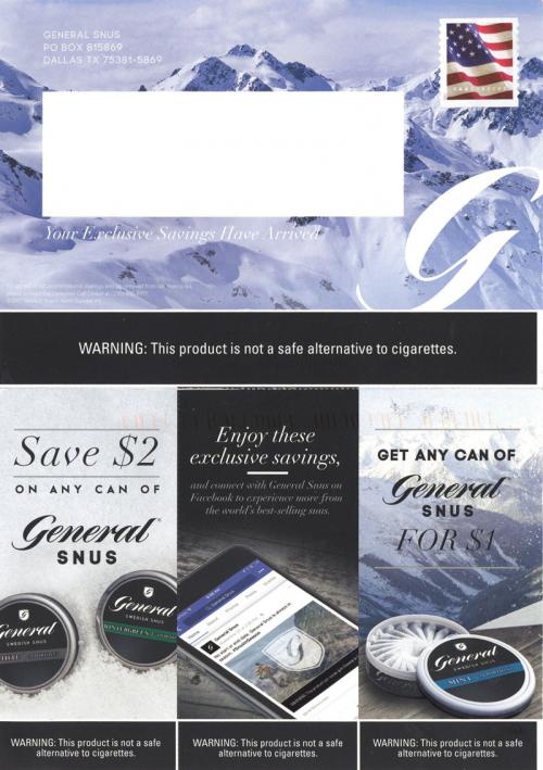 Direct mail from General Snus in February 2017 containing coupons. Invites the recipient to find retail locations on their brand website and connect with the brand on Facebook. Has images of mountains and a snowboarder. Text: "Don't miss a moment."