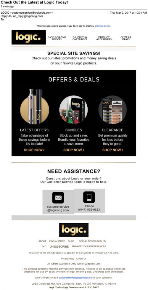 Logic email from March 2017 reminding the recipient to check out the latest promotions and sales on the brand website, including bundled products and items on clearance.