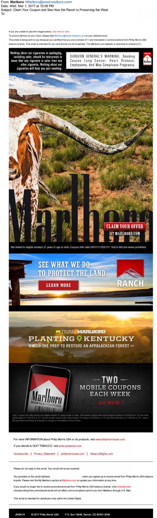 Email from Marlboro in March 2017 linking to new available monthly coupons to claim, as well as some featured environmental and land protection projects headed by the Ranch and Team Marlboro. Also reminds the recipient about accessing the brand website with a mobile phone or device to get two extra weekly coupons.
