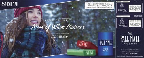Direct mail from Pall Mall received in March 2016 depicting a woman in the snow on the inside and containing coupons. Text: "It's all about experience. It's genuine, not pretentious. It's knowing, not guessing. It's quality, without the cost."