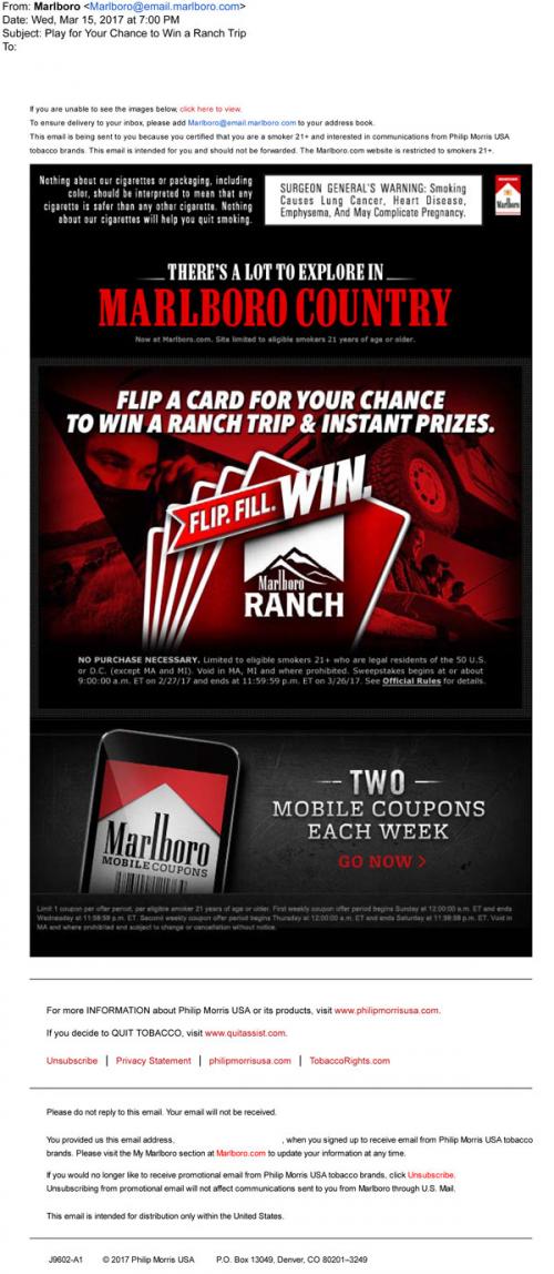 Email from Marlboro in March 2017 promoting the Flip Fill Win sweepstakes, and linking to the brand website to enter. Also promotes accessing the website with a mobile device to claim two extra coupons a week.