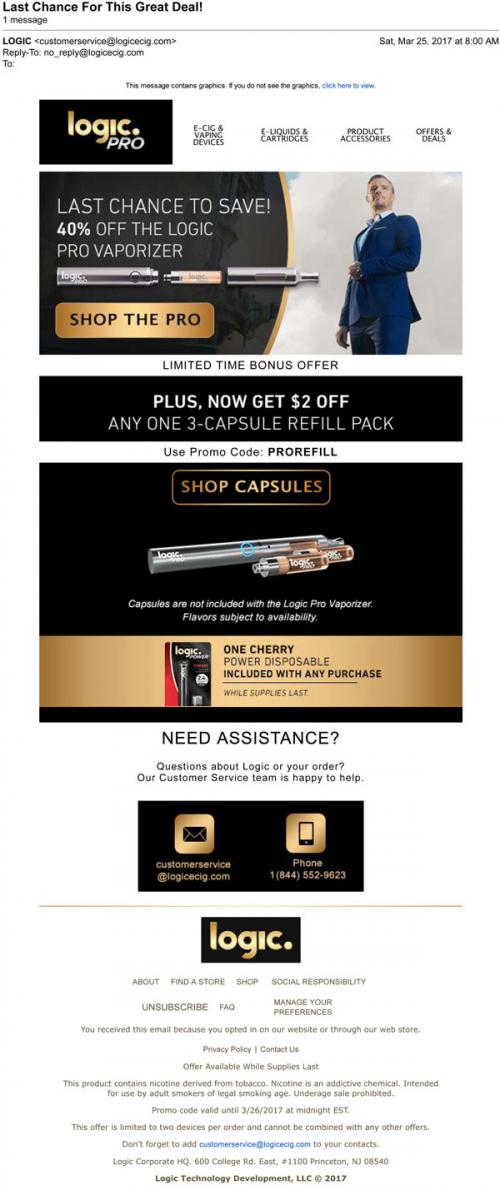 Logic email from March 2017 promoting the end of a sale on their Pro products. Also mentions a free disposable flavored e-cig included with any purchase through the brand website.