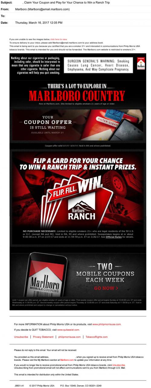 Email from Marlboro in March 2017 reminding the recipient to claim a coupon offer on the brand website. Also links to play the Flip Fill Win sweepstakes and mentions the bonus weekly coupons available when accessing the site via a mobile device.