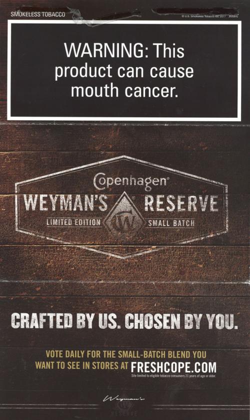 Direct mail from Copenhagen received in March 2017 inviting the recipient to vote daily on which small-batch blend of Weyman's Reserve product should be released in stores. Includes cards describing each of the blends, which include wintergreen and mint. Some different coupons were observed in different mailings. Text: "Crafted by us. Chosen by you."