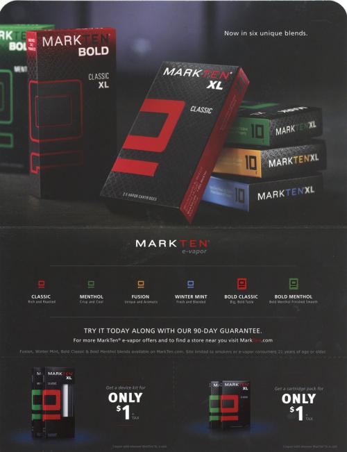 Direct mail from MarkTen in March 2017 promoting their 'six unique blends,' including their bold styles. Includes coupons.