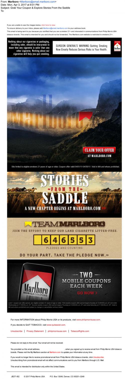 Email from Marlboro in April 2017 linking to the brand website to claim monthly coupons and check out a new series called "Stories from the Saddle." Also promotes becoming a Team Marlboro member to "keep our land cigarette litter-free" and shows the current number of pledges. Reminds the recipient to claim extra weekly coupons on their mobile phone.
