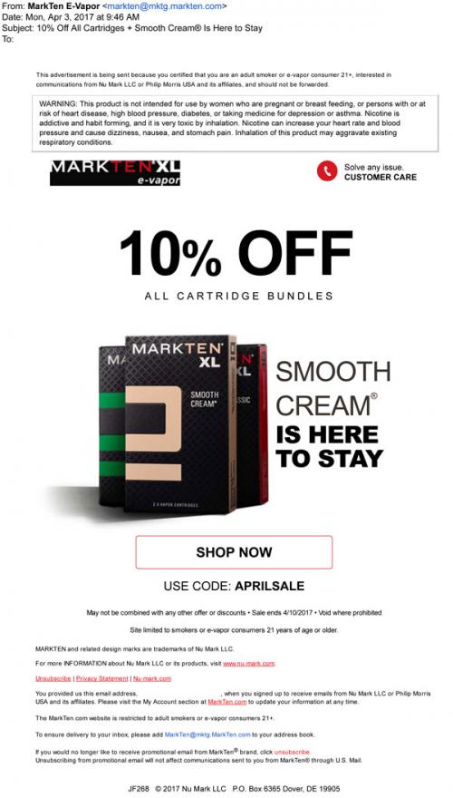 MarkTen email from April 2017 announcing that their 'smooth cream' cartridge flavor will now be a permanent product. Includes an offer for discounted cartridge bundles purchased through the online store.