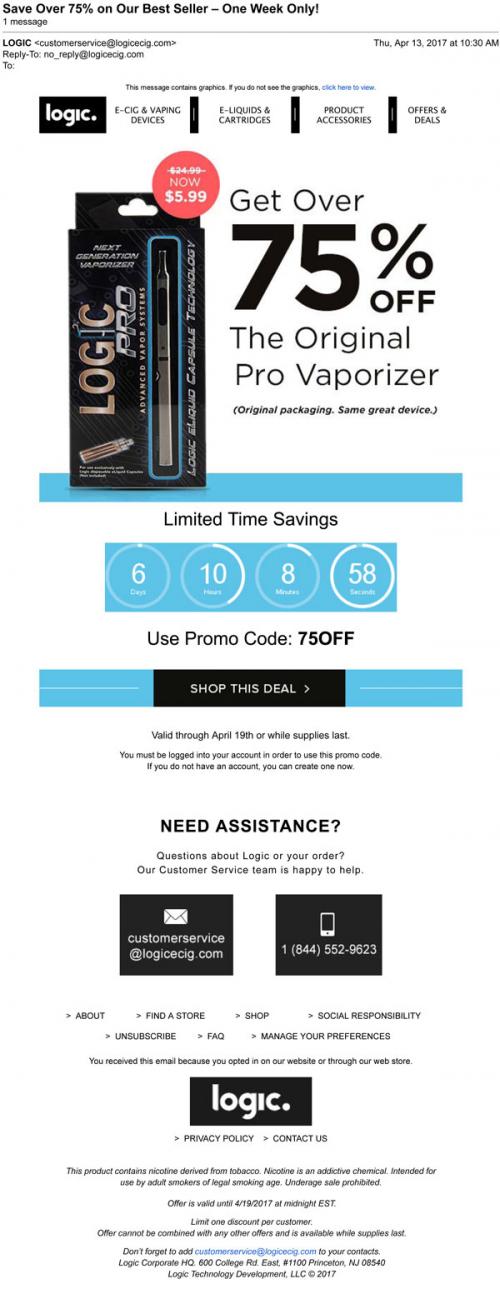 Logic email from April 2017 announcing a limited time sale on their original Pro vaporizer product. Links to the brand website to purchase.