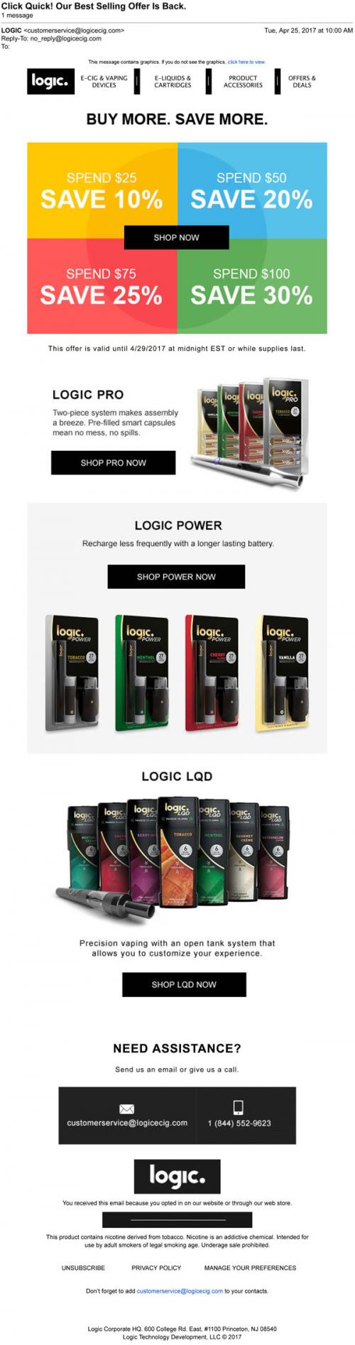 Logic email from April 2017 promoting an ongoing sale at the brand website. Has images of various products, such as the Pro, Power rechargeable, and various flavors of the LQD tank system.