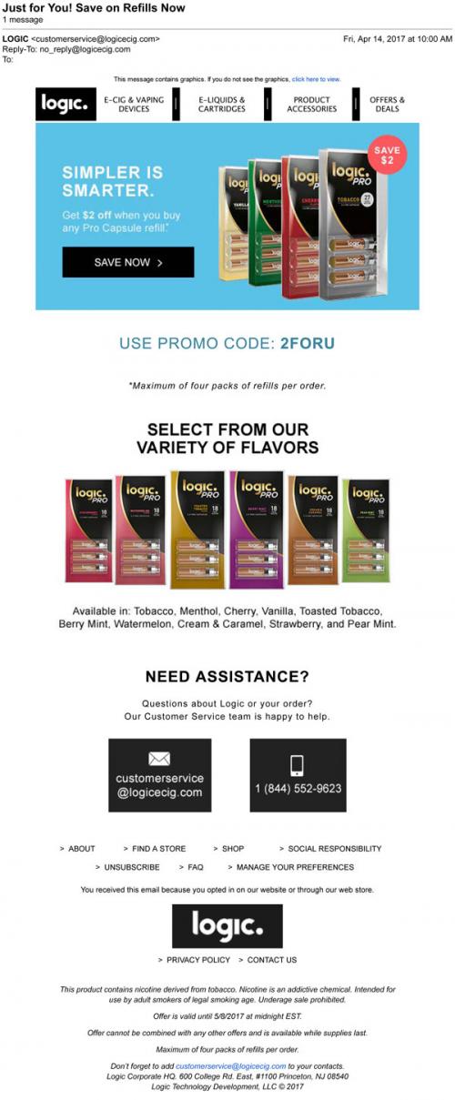 Email from Logic in April 2017 with an online coupon offer good for 2$ off a cartridge pack purchase through the brand website. The email promotes the variety of flavors available and provides a link to the online store, with the necessary promo code.