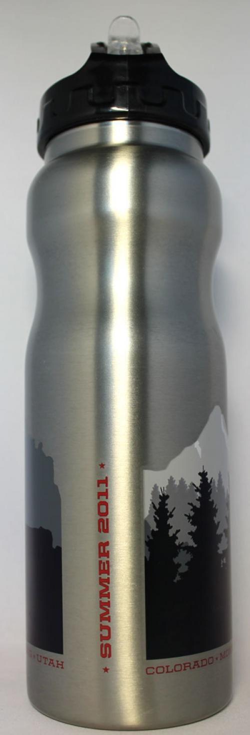 Direct mail gift from Marlboro received in October 2011 as a thanks for joining Team Marlboro and their efforts towards conservation. The custom water bottle is silver and has the image of mountains and forests on it, and arrived in a plain cardboard box.