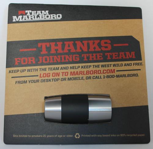 Direct mail gift from Team Marlboro as "thanks for joining the team." Received in August 2011, the LED flashlight comes with a card that promotes the brand website and was sent in a black bubble mailer.